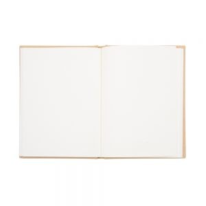 Bloco de Anotações Ecológico, material em kraft. Frente e verso liso com fita elástica para fechar. Contém aproximadamente 80 folhas amareladas sem pauta.