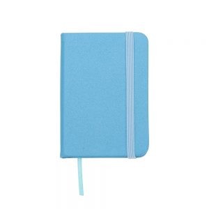 Mini Caderneta tipo moleskine, produzida em material sintético brilhante com marcador de página em cetim e fita elástica para fechar. Contém aproximadamente 80 folhas amareladas sem pauta